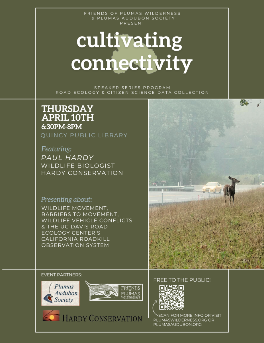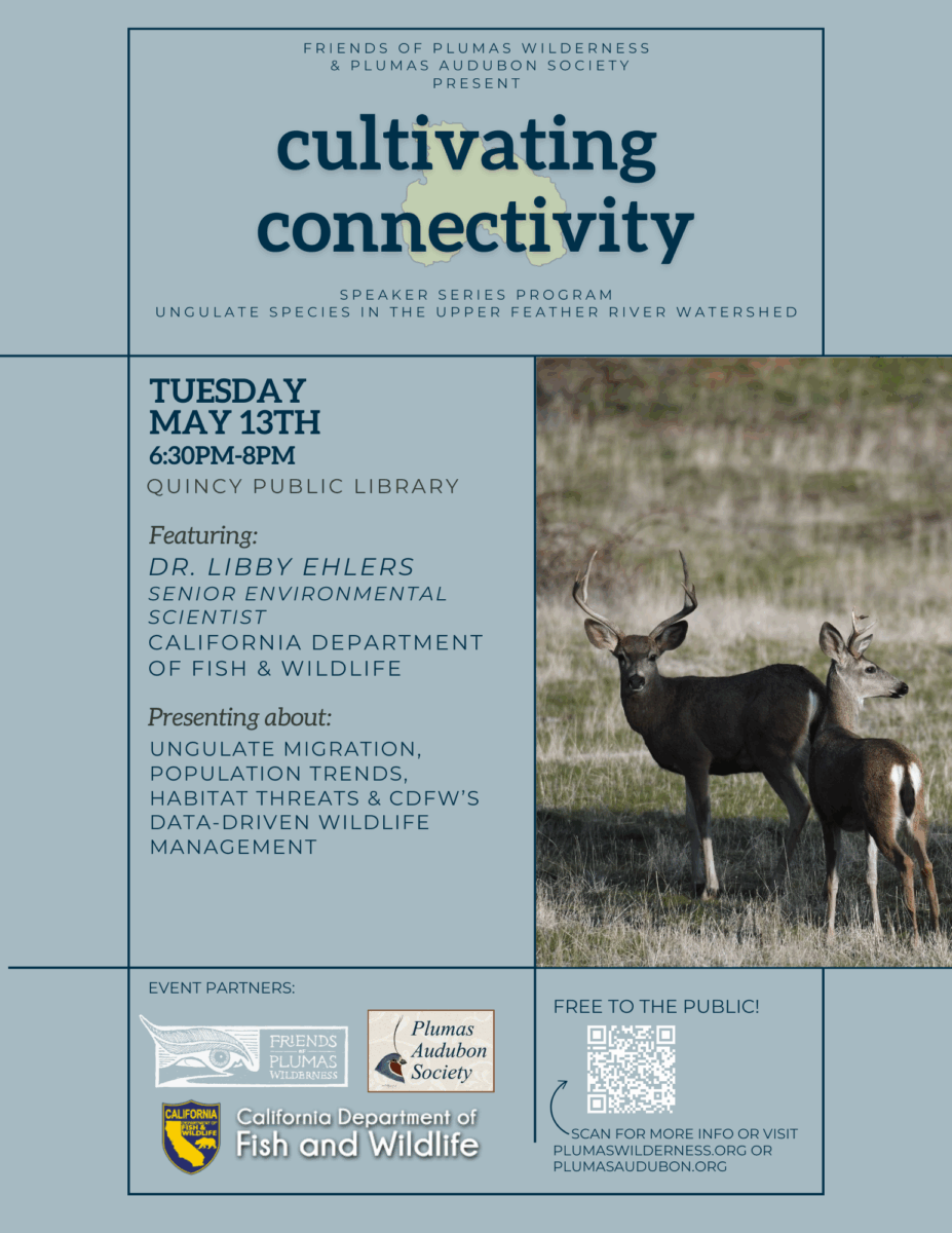 Speakers will highlight both the challenges and opportunities in supporting the long-term health of ungulate species, and attendees will come away with a deeper understanding of how science, stewardship, and citizen engagement can work together to support wildlife connectivity in the Upper Feather River Watershed.