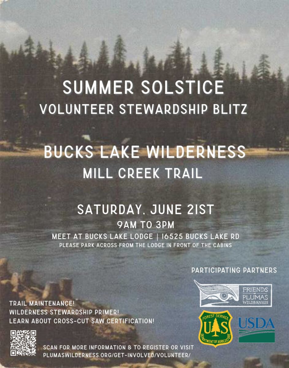 Join us and our partners at the Mt. Hough Ranger District for an all-hands- on-deck volunteer stewardship trail maintenance blitz on the Right Hand Branch of Mill Creek Trail in the Bucks Lake Wilderness.